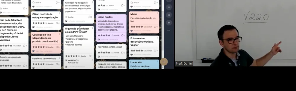 “Em tempo real, eu projetei na tela para todos (presencial e no Zoom) e o mural se modificava conforme surgiam novos posts dos alunos. Fiz correções, dei feedback e destaquei diversos pontos e provocações referentes ao conteúdo do encontro”, comenta Vialôgo.