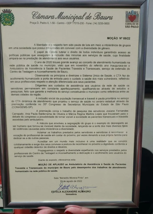 Professora do curso de Serviço Social da ITE, Josiane Fernandes Lozigia Carrapato recebeu uma Moção de Aplauso da Câmara de Vereadores de Bauru pelo trabalho "Da invisibilidade à visibilidade da população transexual no ambulatório: É possível?".