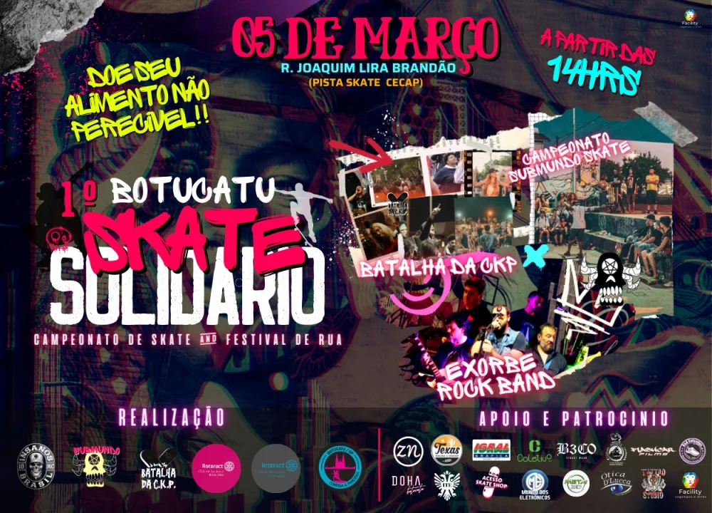 Avenida Alcides Cagliari, 2601 - Jardim AeroportoRealizado no dia 5 de março, na praça da Cekap, o "1º Botucatu Skate Solidário" conta com o apoio cultural da ITE Botucatu. O evento arrecadará alimentos para o projeto "Preservando o Futuro", do distrito de Rubião Júnior, até o dia 10 de março.