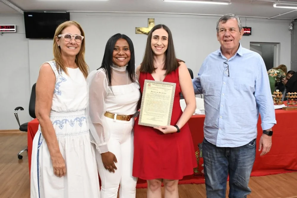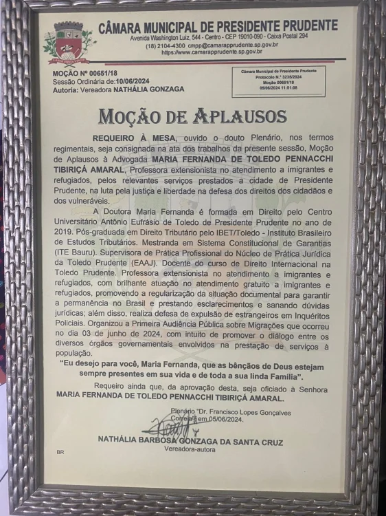 Mestranda em Direito da ITE, Maria Fernanda de Toledo Pennacchi Tibiriçá Amaral recebeu, no dia 10 de junho, uma Moção de Aplausos da Câmara Municipal de Presidente Prudente, em reconhecimento aos relevantes serviços prestados aos imigrantes e refugiados, um trabalho que surgiu a partir da sua dissertação de mestrado e que integra o programa de extensão da Toledo Prudente, onde a iteana atua como supervisora de prática profissional.