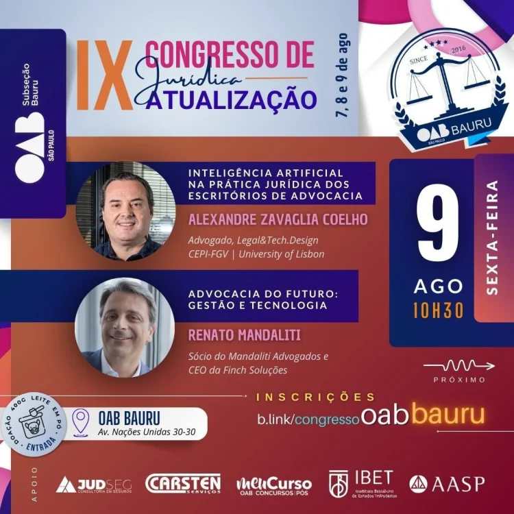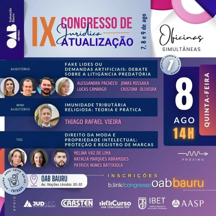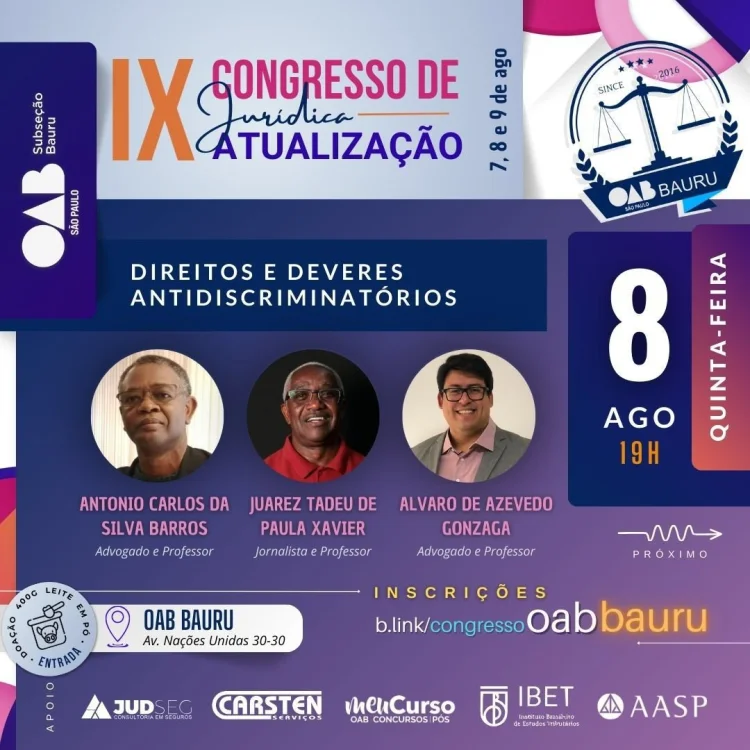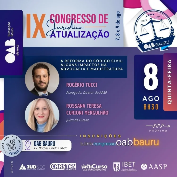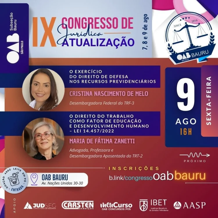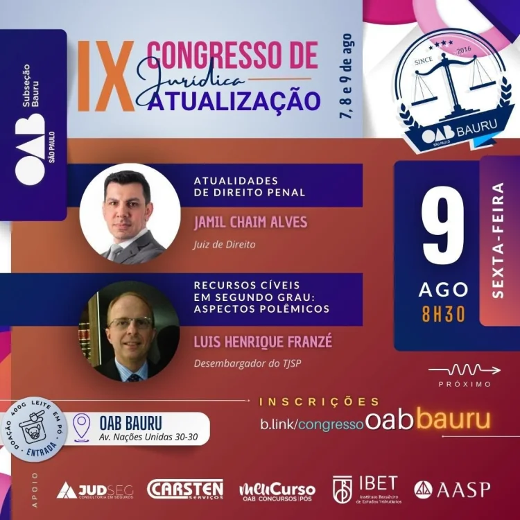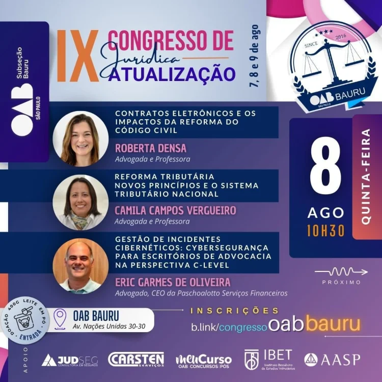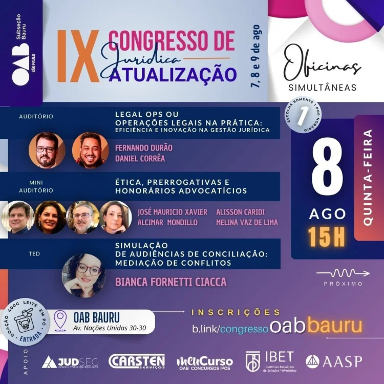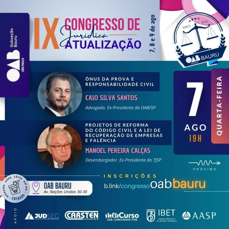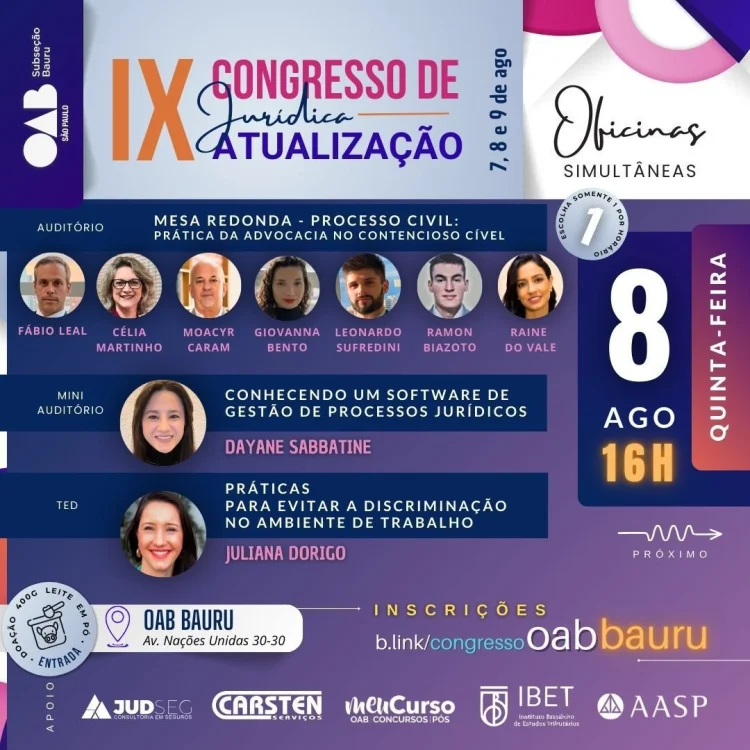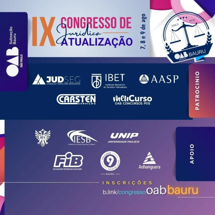 Nos dias 7, 8 e 9 de agosto, a OAB Bauru realiza o seu "IX Congresso de Atualização Jurídica". A ITE é uma das parceiras do evento.