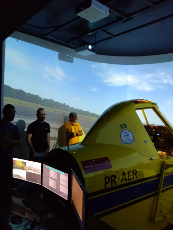 Ainda Aeroglobo, o grupo pode adquirir noções sobre a operação de voo da aeronave agrícola Air Tractor, através da observação das particularidades no acionamento do seu motor turboélice, de um voo de aplicação, e do corte do motor, no simulador de voo.