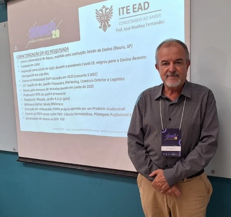 Nos dias 10 e 11 de setembro, o professor doutor José Munhoz Fernandes, supervisor do Núcleo de Educação a Distância (NEaD) e coordenador dos cursos EaD (área de negócios) da ITE, participou com apresentação de trabalhos do 20º Seminário Nacional de Educação a Distância (Senaed), promovido pela Associação Brasileira de Educação a Distância (ABED), em São Paulo.