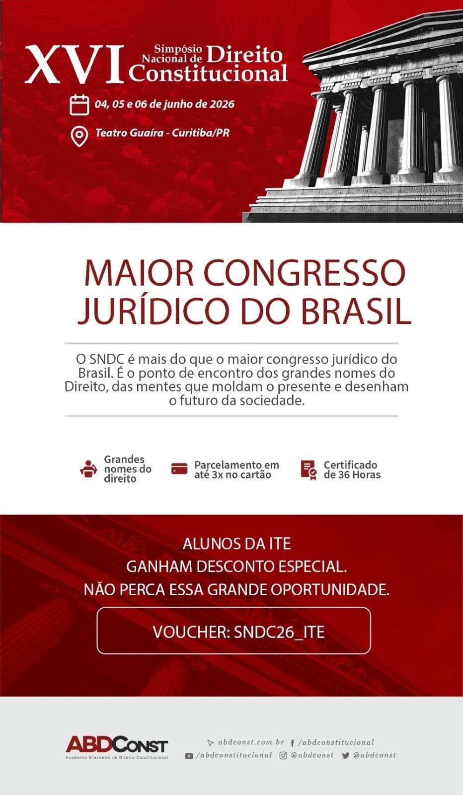 A ITE firmou parceria com a organização do "XVI Simpósio Nacional de Direito Constitucional (SNDC)", possibilitando que nossos alunos e professores tenham acesso a um desconto especial na inscrição.