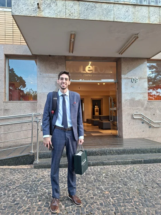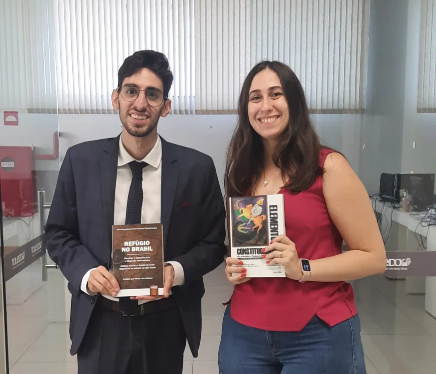 Em uma das fotos, João está ao lado da professora de Direito Internacional e coordenadora do Núcleo de Prática Jurídica, Maria Fernanda de Toledo Pennacchi Tibiriçá Amaral.